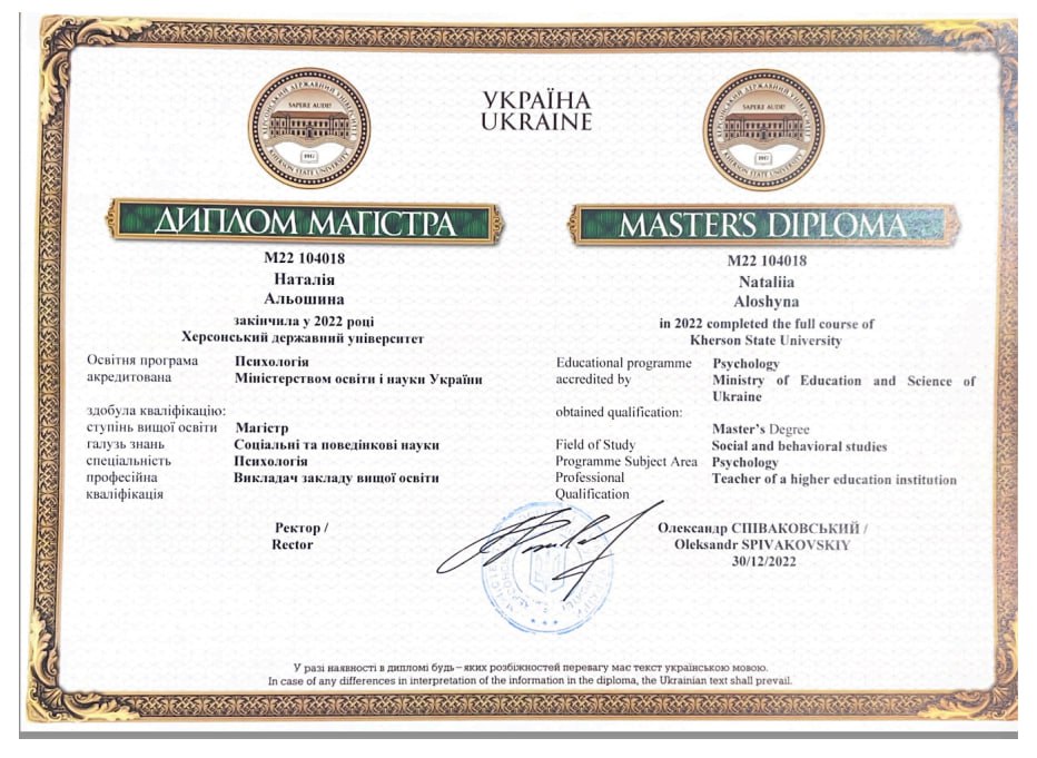 - Сертифікована і акредитована терапевтка і супервізор НАГТУ